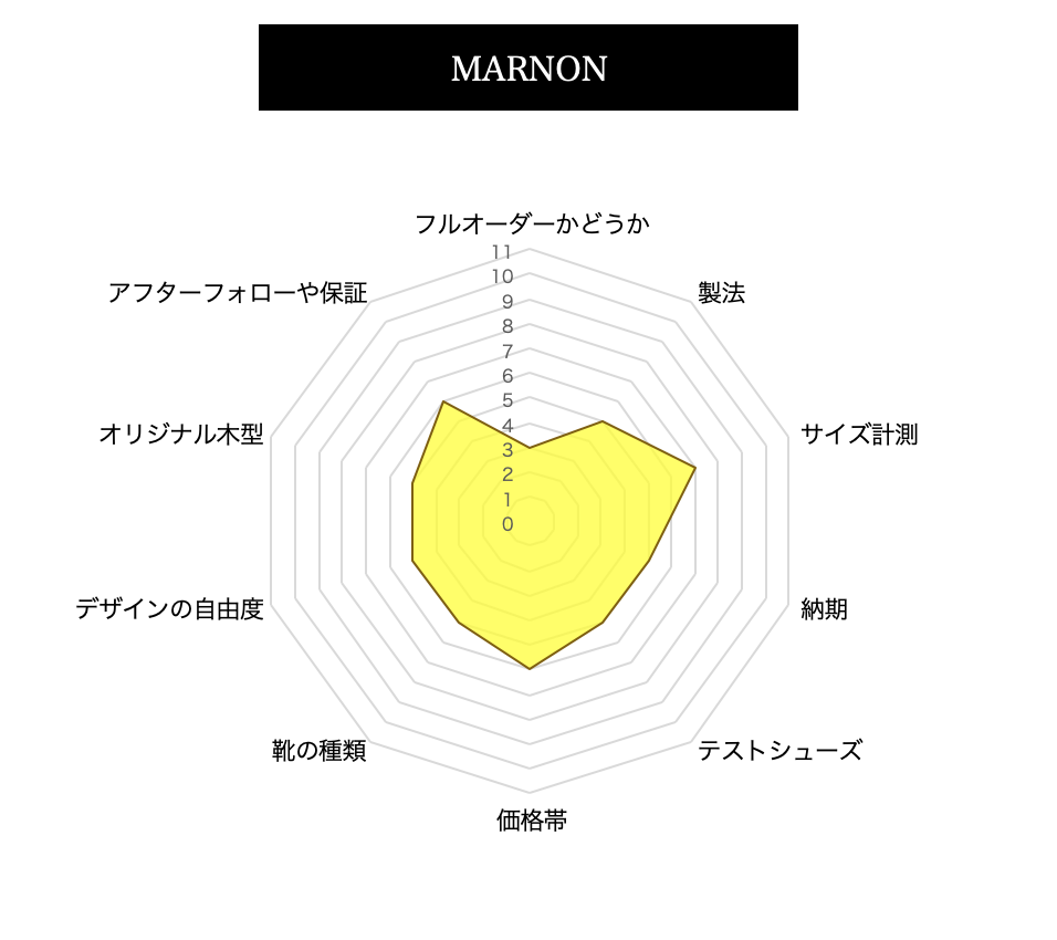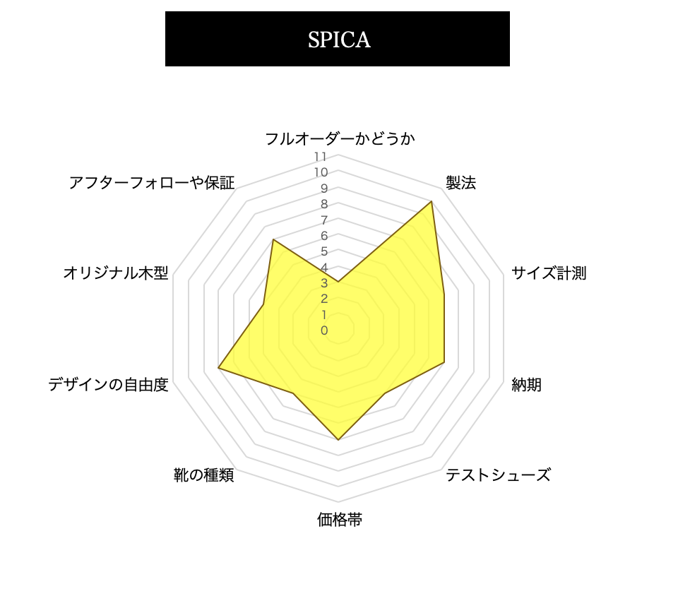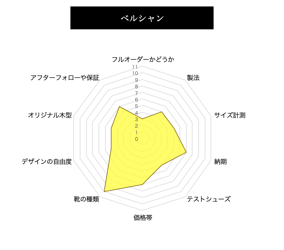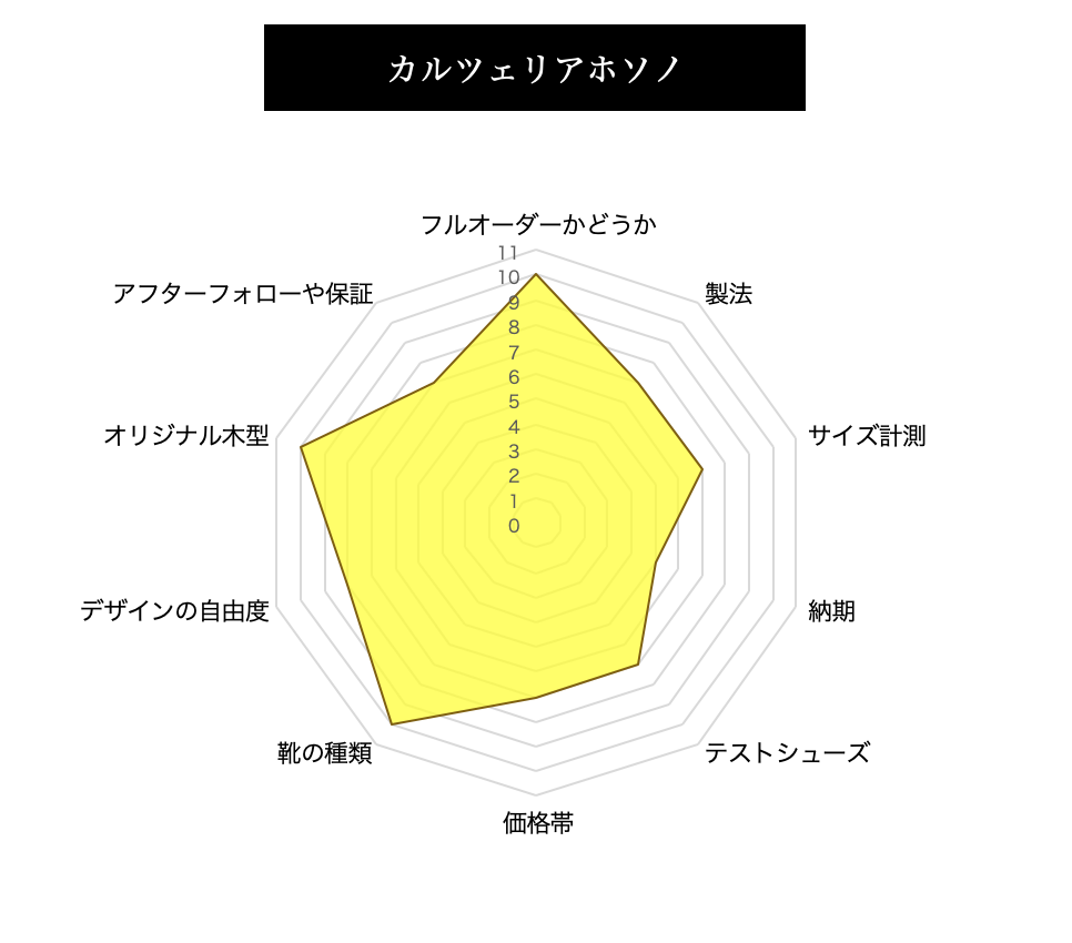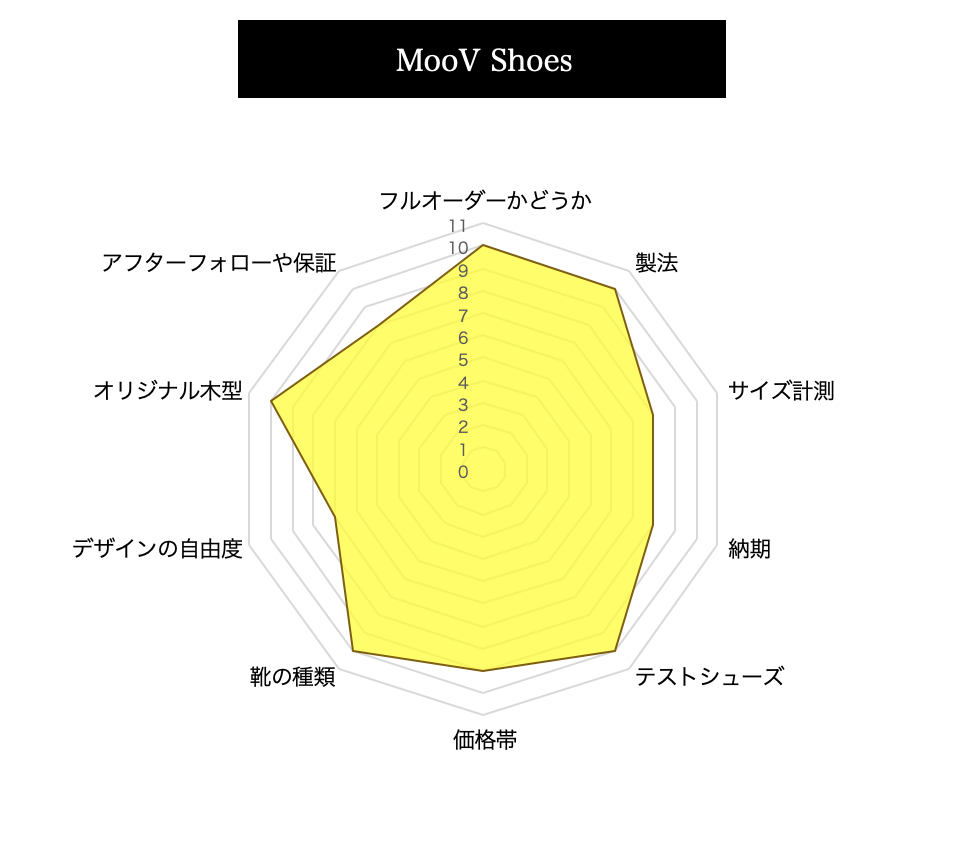 当サイトでは、まだまだ一般的ではないオーダーシューズ、オーダーパンプスを各指標を設けて、評価をしております。