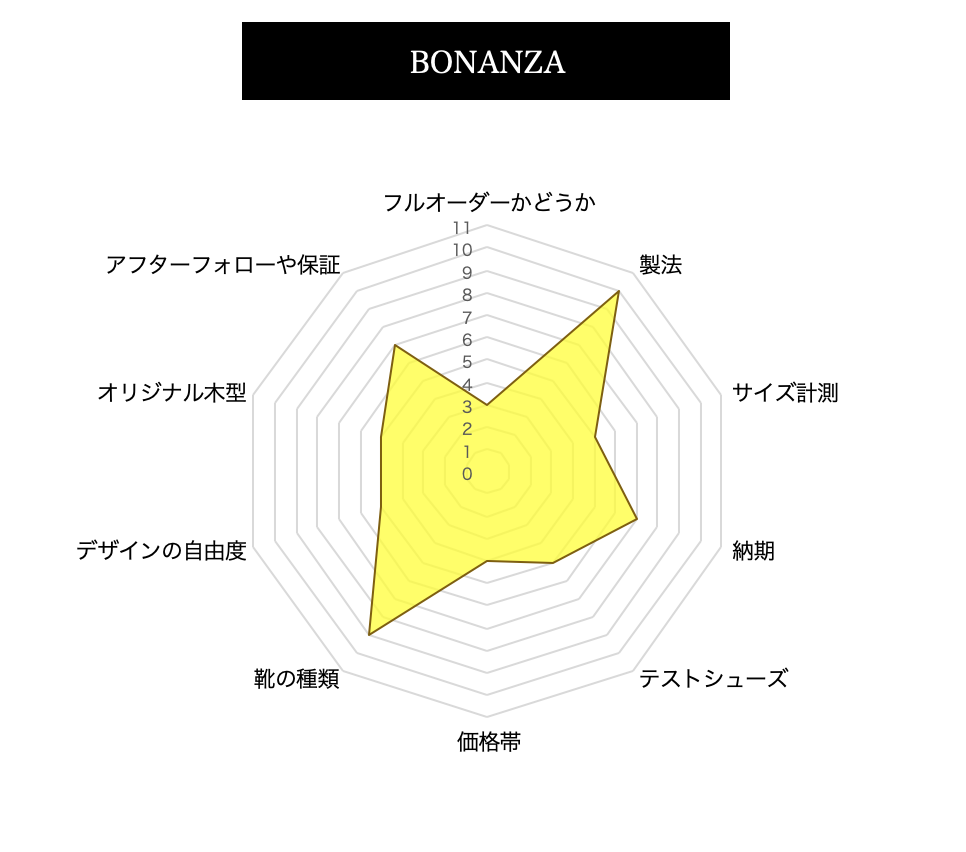 オーダーメードシューズを作る上で、必要な靴木型です。 ここでは、お客様個人個人用につくられた靴木型なのかそれ以外かで評価します。 ・オリジナル靴木型:10点 ・パターン靴木型:5点 ・既製品:3点